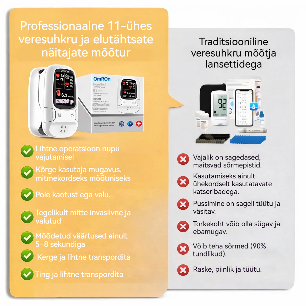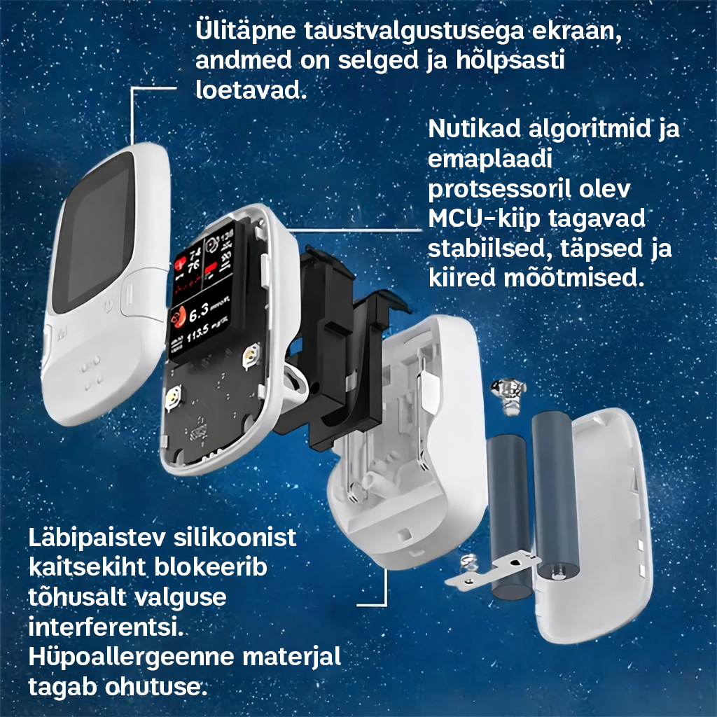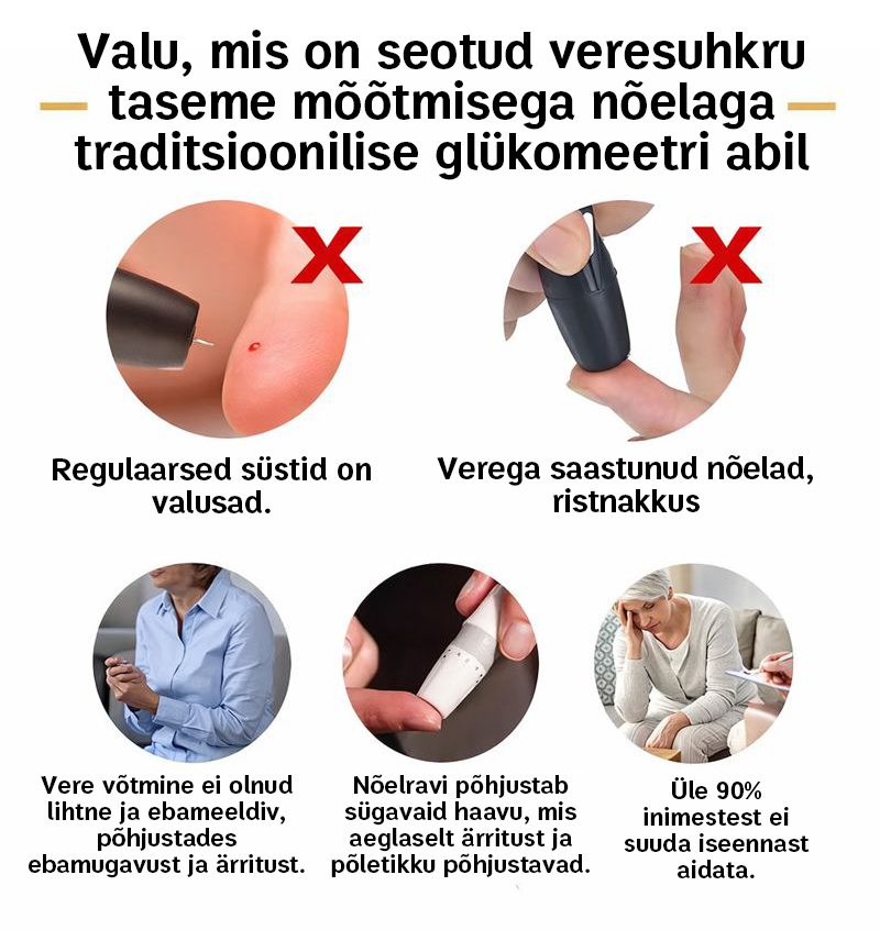 Jätke hüvasti invasiivsete ja riskantsete veresuhkru mõõtmistega! Mõõtke oma veresuhkrut ohutult ja vältige ristinfektsiooni või sõrmeotsaga torkamise ohtu.