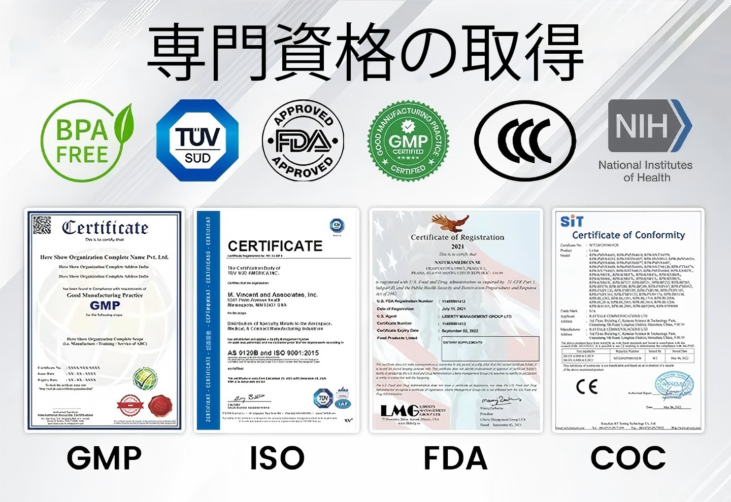 各種認証:FDA、CE、ISO 13485、GMP