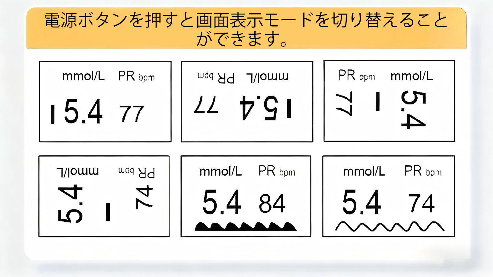 電源を入れると、Omron™デバイスは電源ボタンを押すたびに表示モードを自動的に切り替えます。これにより、どの角度からでも測定値を快適に読み取ることができます。