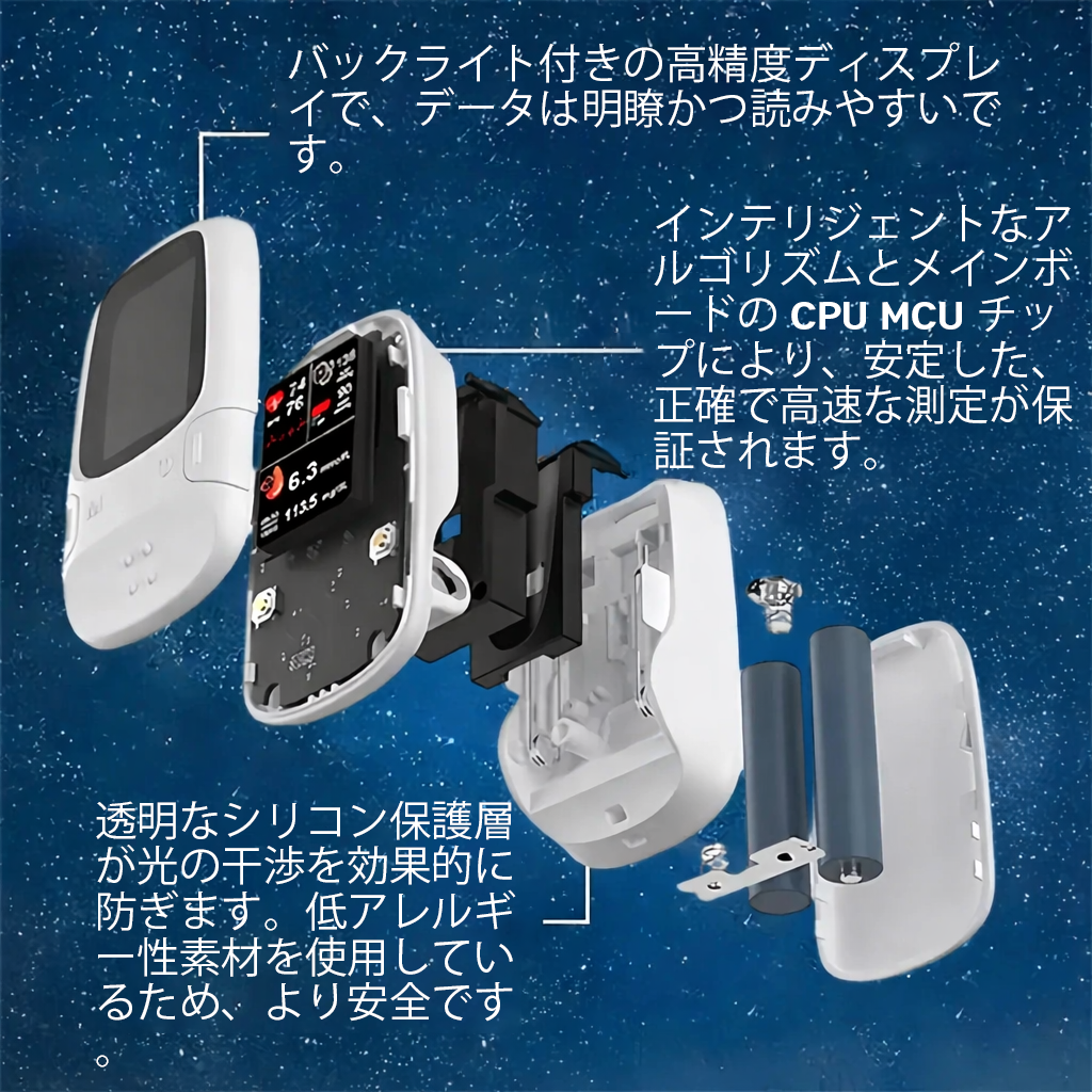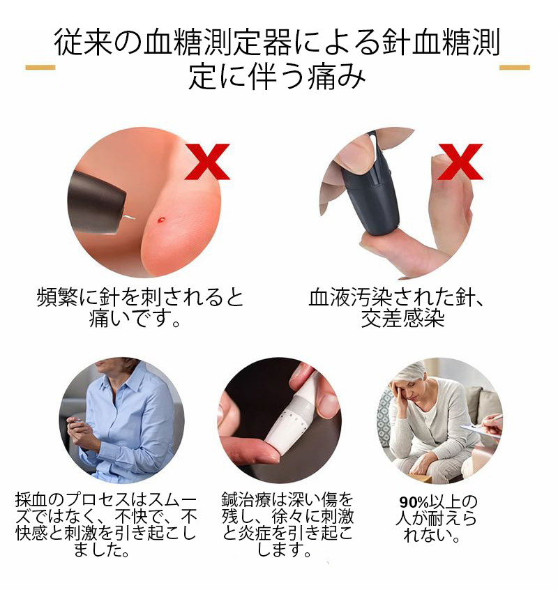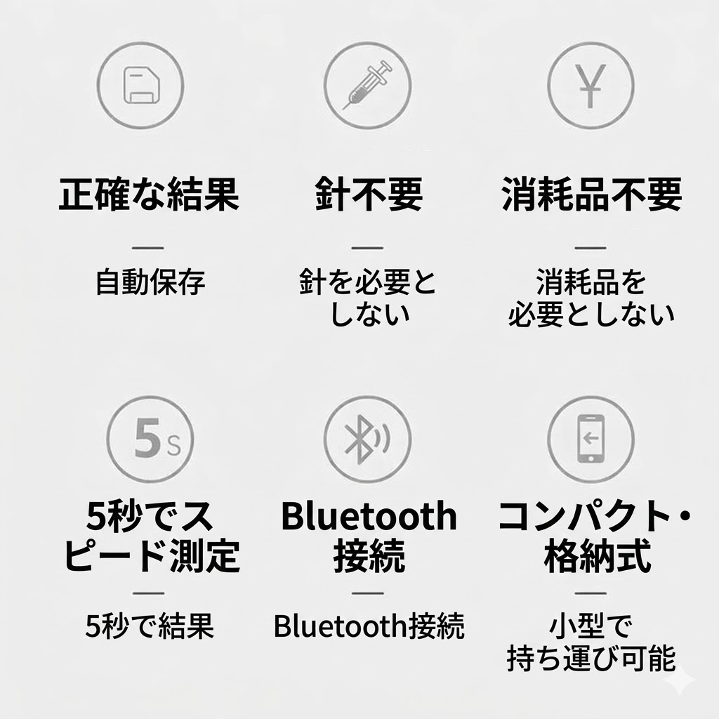 ✅ 完全に非侵襲的な測定:針も出血もなく、高齢者、出産経験のある母親、子供、敏感肌の方にも最適です。